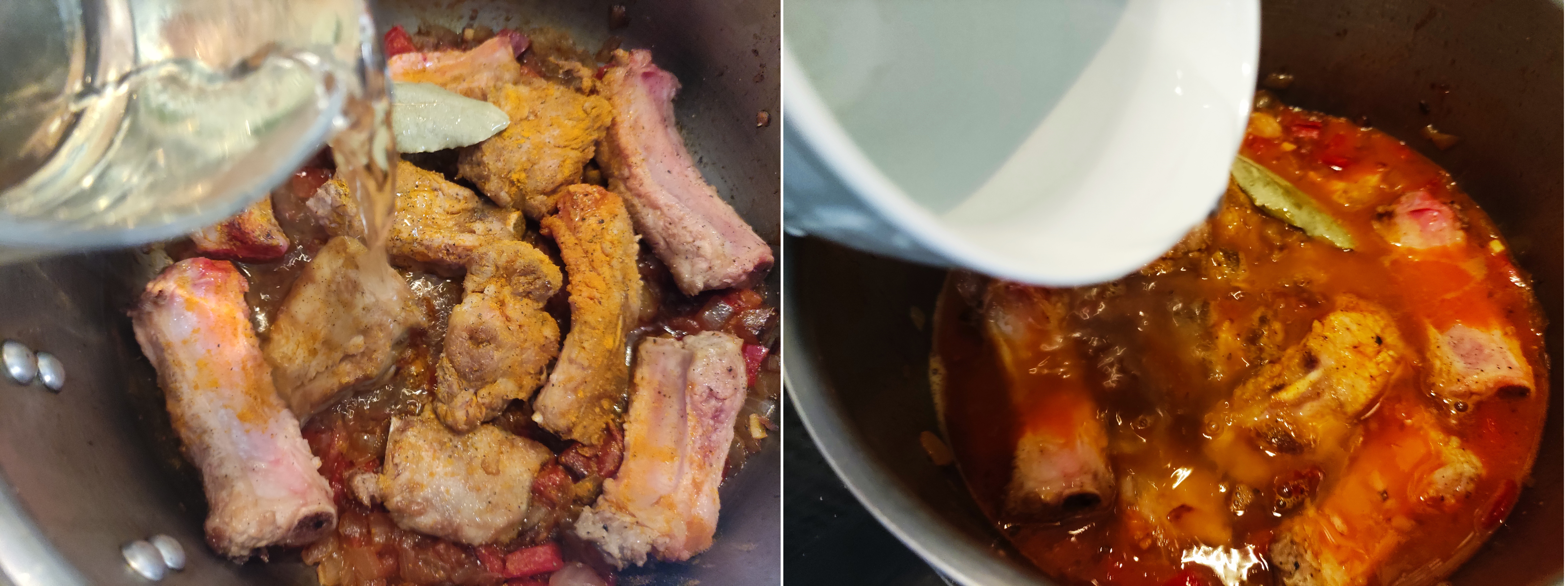 Incorporar las costillas, la hoja de laurel, la pimienta y la cúrcuma. Echar el vaso de vino y hervir 1 minuto para que se evapore el alcohol. Ahora echar un vaso de agua que las cubra. Si no usas olla exprés las costillas deberán cocer 35-40 minutos tapadas, hasta tiernas. Probar y rectificar de sal o especias.