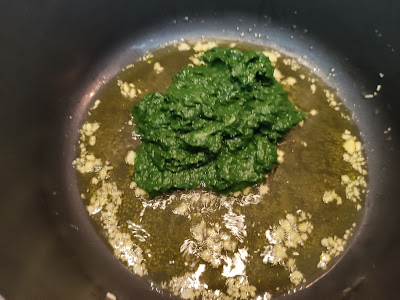 En una cazuela con 3- 4 cucharadas de aceite, freír los dos dientes de ajo muy picaditos y echar las espinacas, remover mientras las rehogamos para que se integre con el aceite y quede como una pasta espesa.